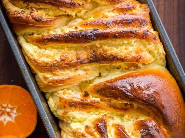 The crumbs of this woven Easter bread are the softest. It's spiked with farm cheese, garnished with almonds and orange zest, giving the whole loaf an excellent flavor and aroma. Make this Easter bread your new Easter tradition. This blend of cheese Paska and classic Kulich into an impressive Easter bread!
